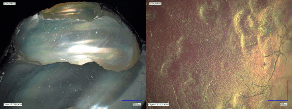 Les données scientifiques sur la nacre et sa matrice organique calcifiante proviennent principalement de l’étude de mollusques Pinctada et Pinna pour les bivalves et des espèces d’Haliotis pour la nacre sécrétée par les gastéropodes. Différents empilements des tablettes d’aragonite peuvent être observés en coupe par microscopie électronique à balayage, avec des structures en « briques » ou « colonnes », selon le mécanisme de minéralisation chez les gastéropodes et les bivalves. En revanche, aucune étude ne s’est encore intéressée à l’identification de l’origine de la nacre dans le Patrimoine par l’étude de la microstructure. Le stage de Félix Bical (février – août 2025) a permis de mettre en place un protocole de prise de vues de coquillages à l’échelle macroscopique et de développer des analyses numériques des images en vue de classification des espèces. Des premiers tests, ont pu démontrer la possibilité d’accéder à la surface interne de la nacre et sa microstructure grâce au microscope 3D numérique Keyence VHX7000 combinant des fonctions d’observation sous différentes lumières, de capture d’image et de mesure, et aux microscopes numériques portables (USB) Dino-Lite. L’accès à ces outils de plus en plus démocratiques permettrait de travailler de manière non-destructive sur une première classification par l’étude de la microstructure.